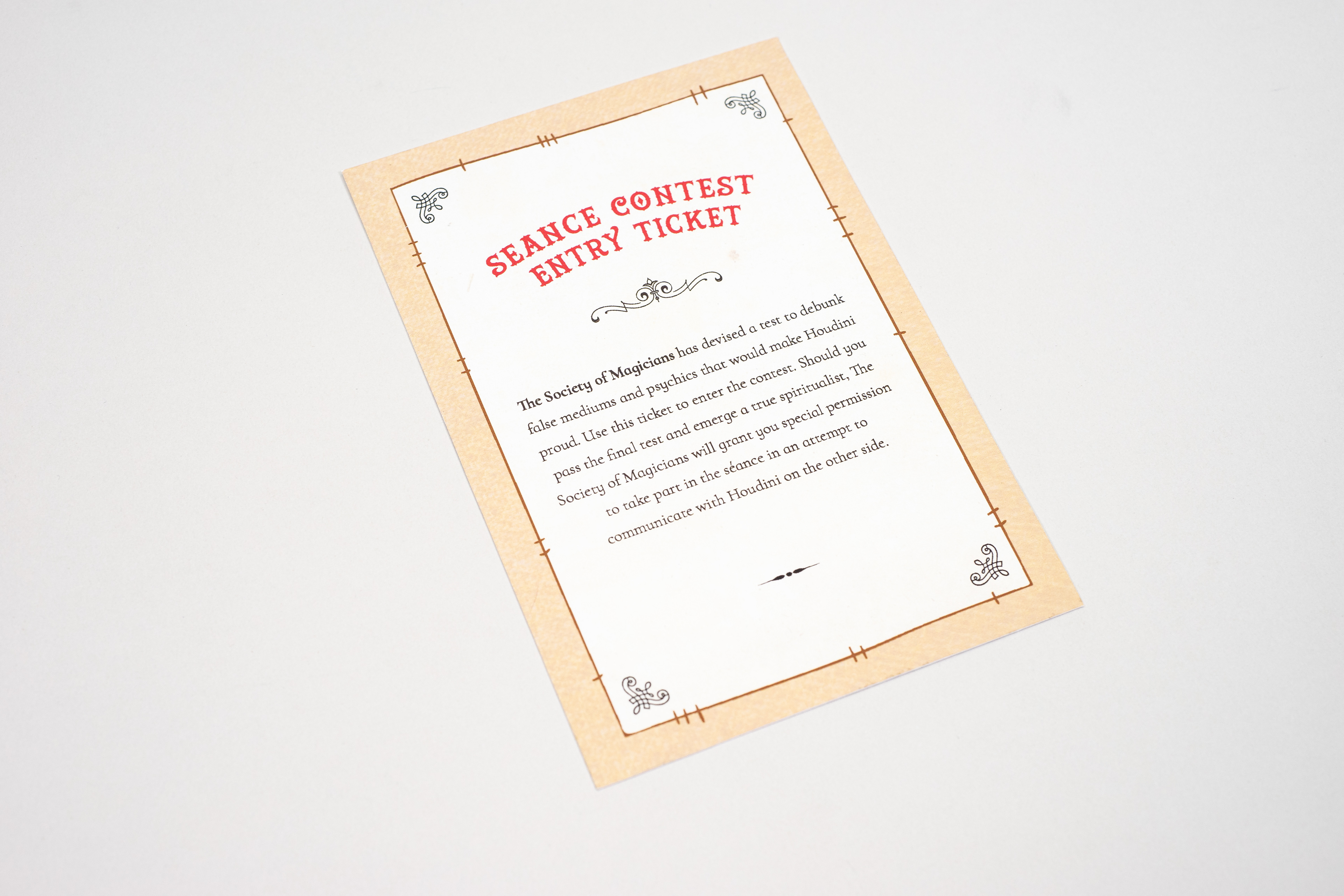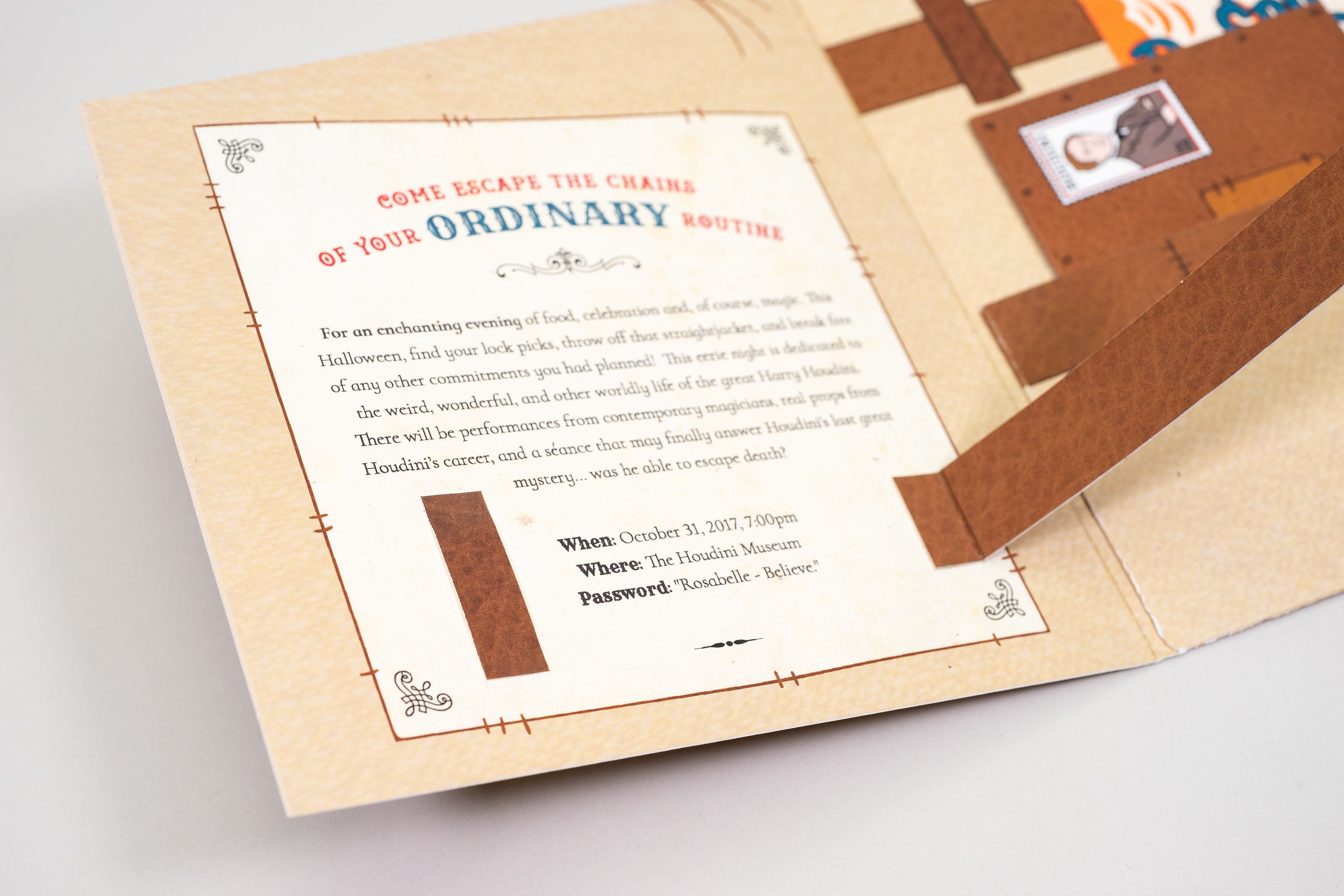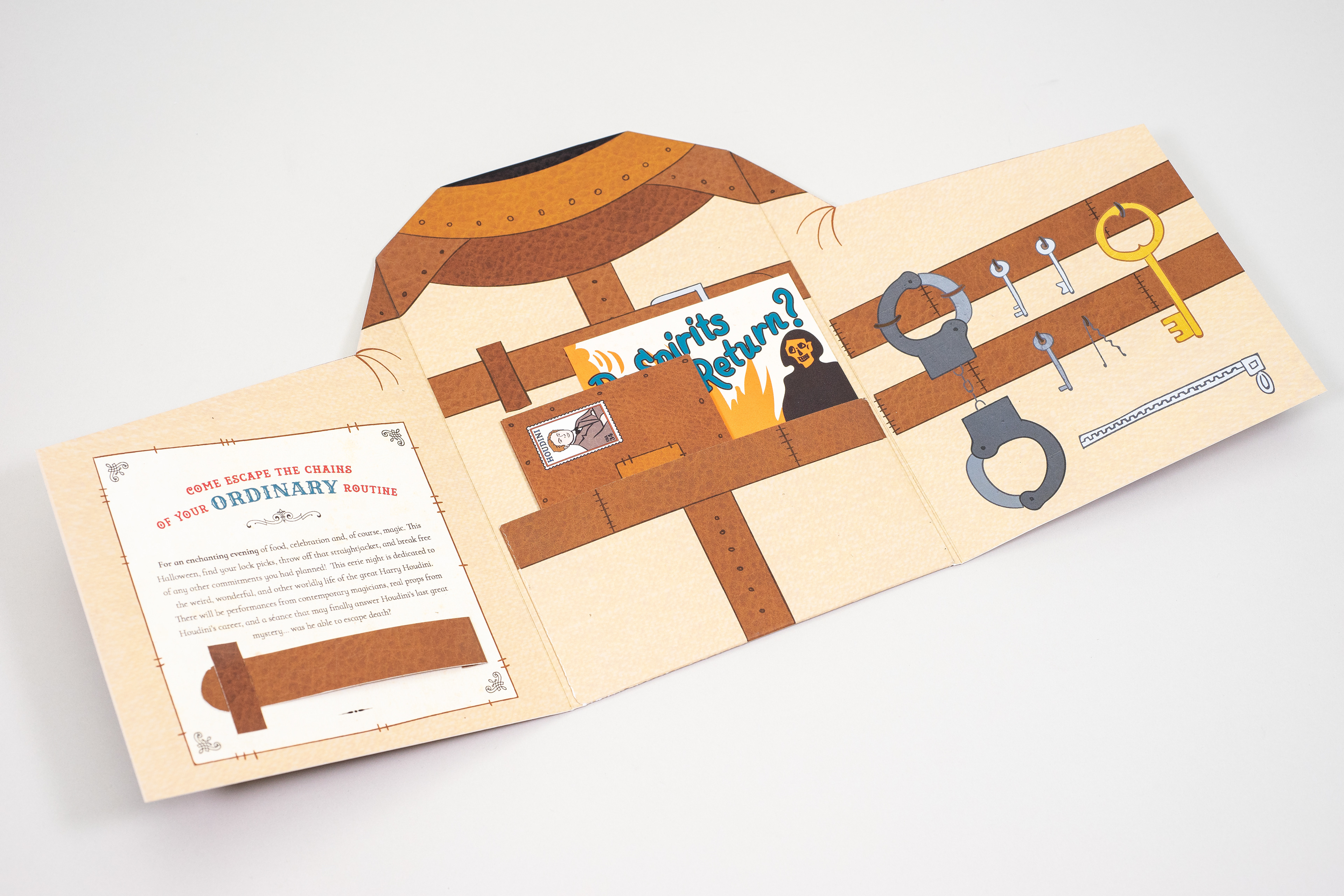 A special invitation for a special occasion. This project is a promotional piece that celebrates the life of famous escape artist Harry Houdini with the event held by the International Brotherhood of Magicians on the anniversary of his birthday. Taking on the physical shape of his famous escape tools, the envelope itself unfolds and opens like Houdini himself was escaping. The invite includes special pieces to participate in different activities for the night, such as a séance made famous by Houdini’s wife, or the Breaking of the Wand ceremony, a tradition which was created to honor Houdini’s passing.