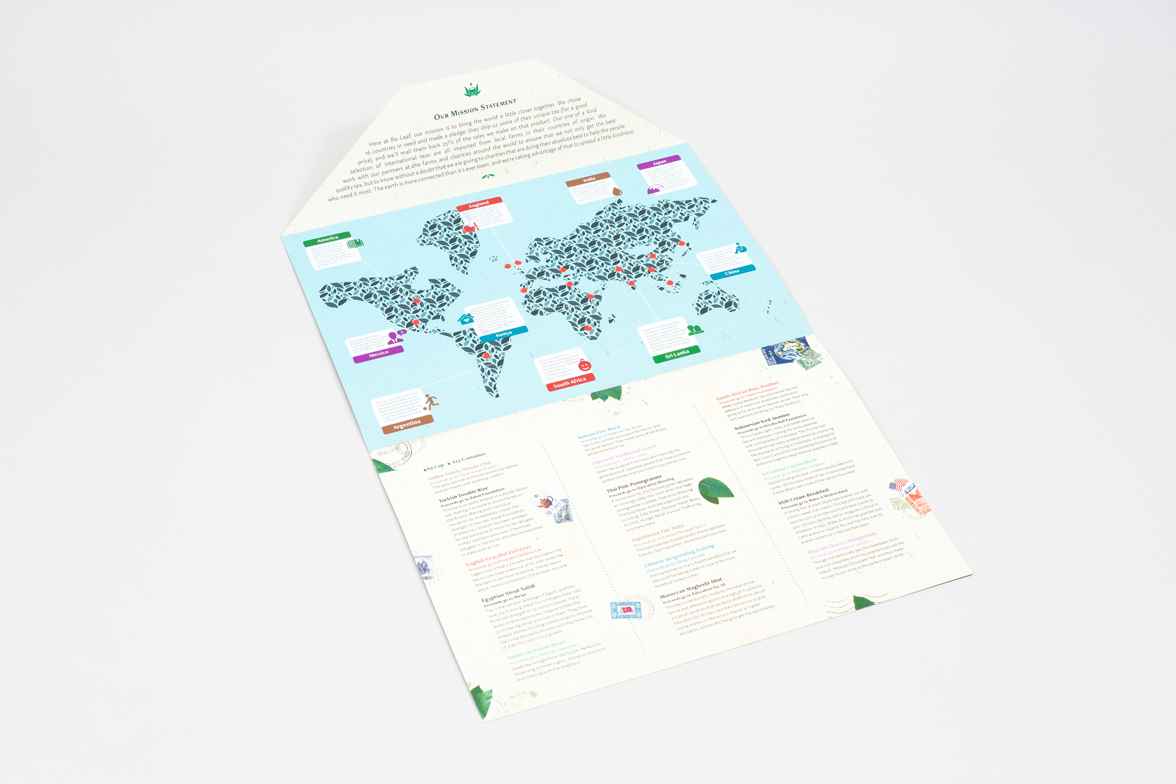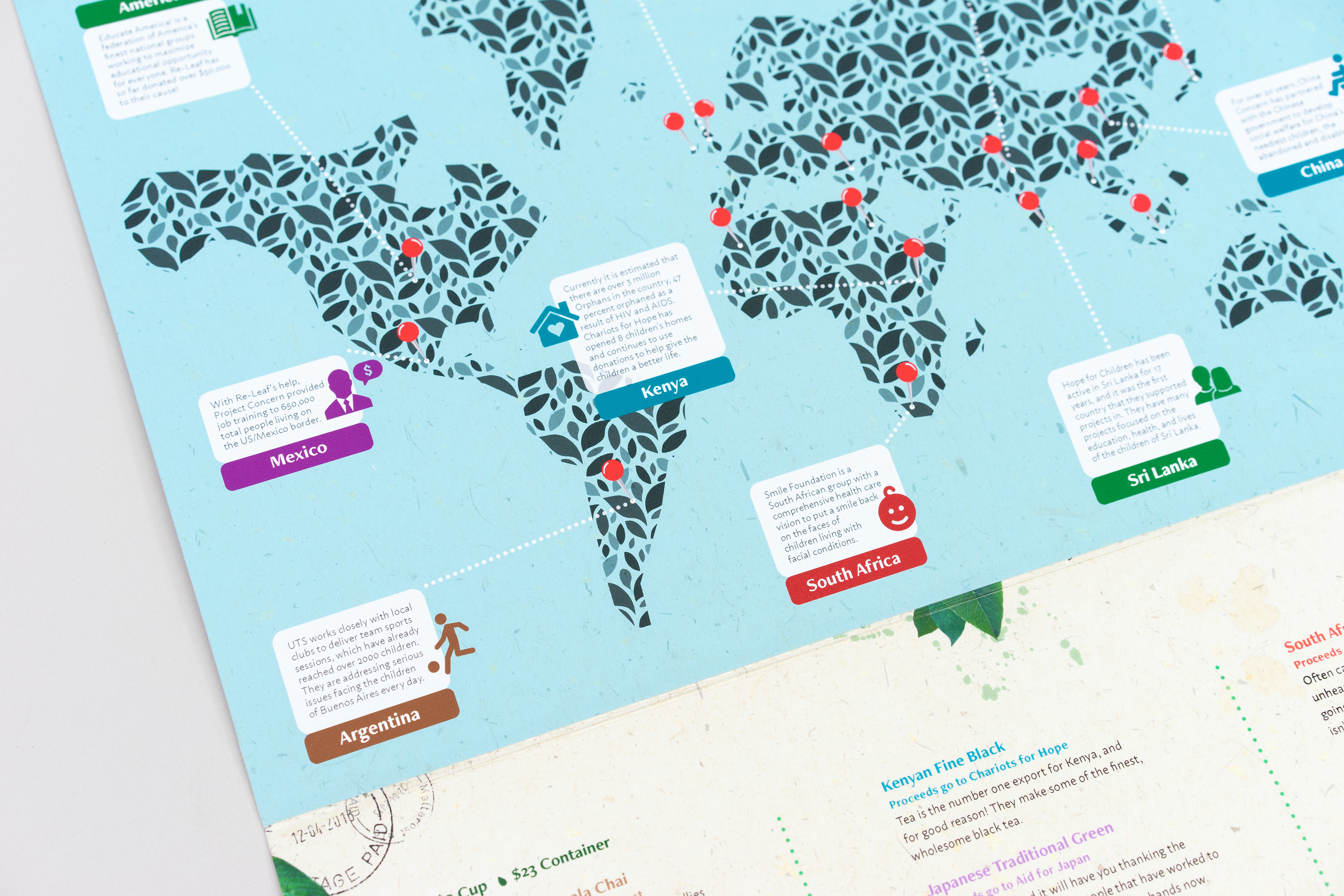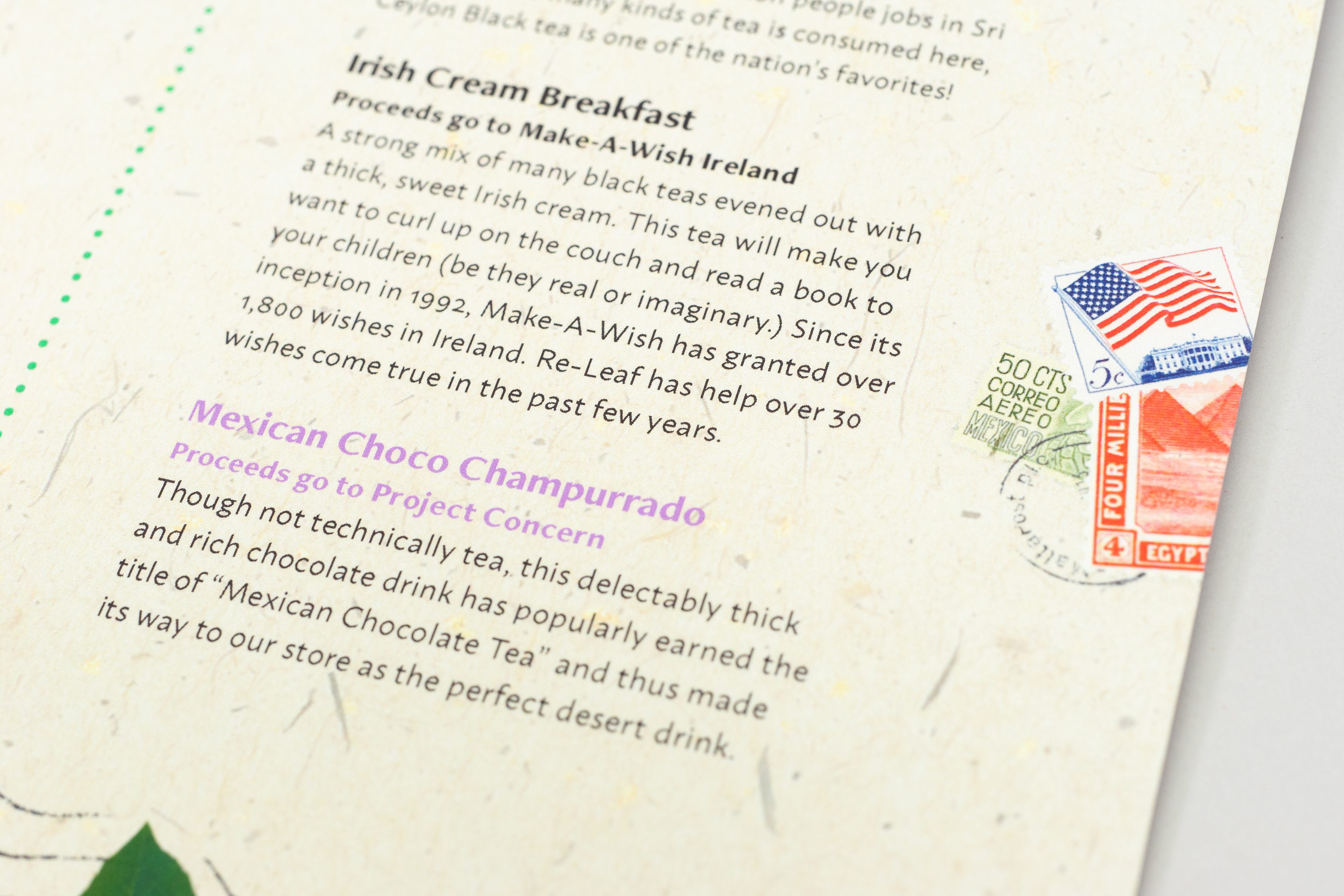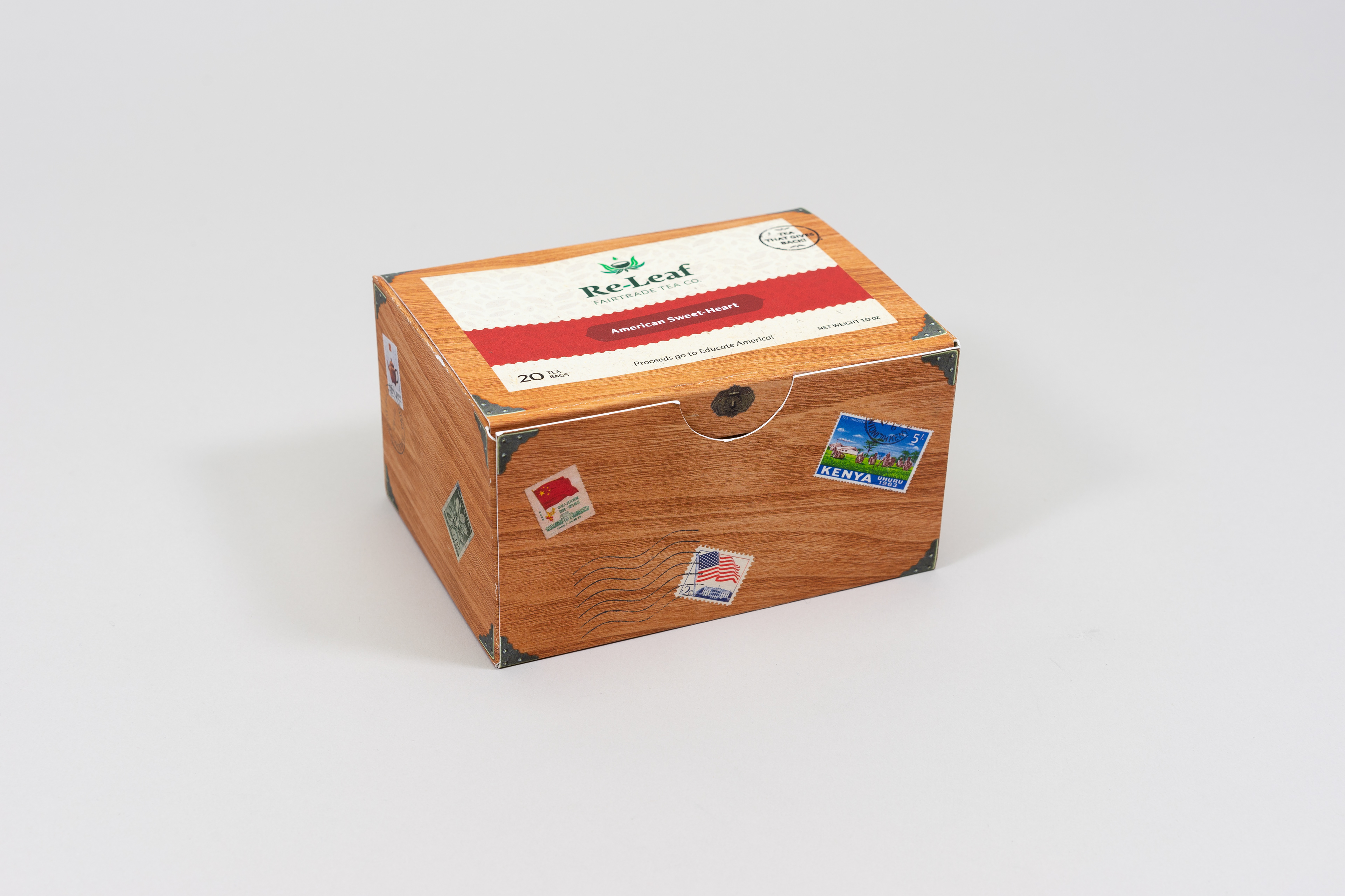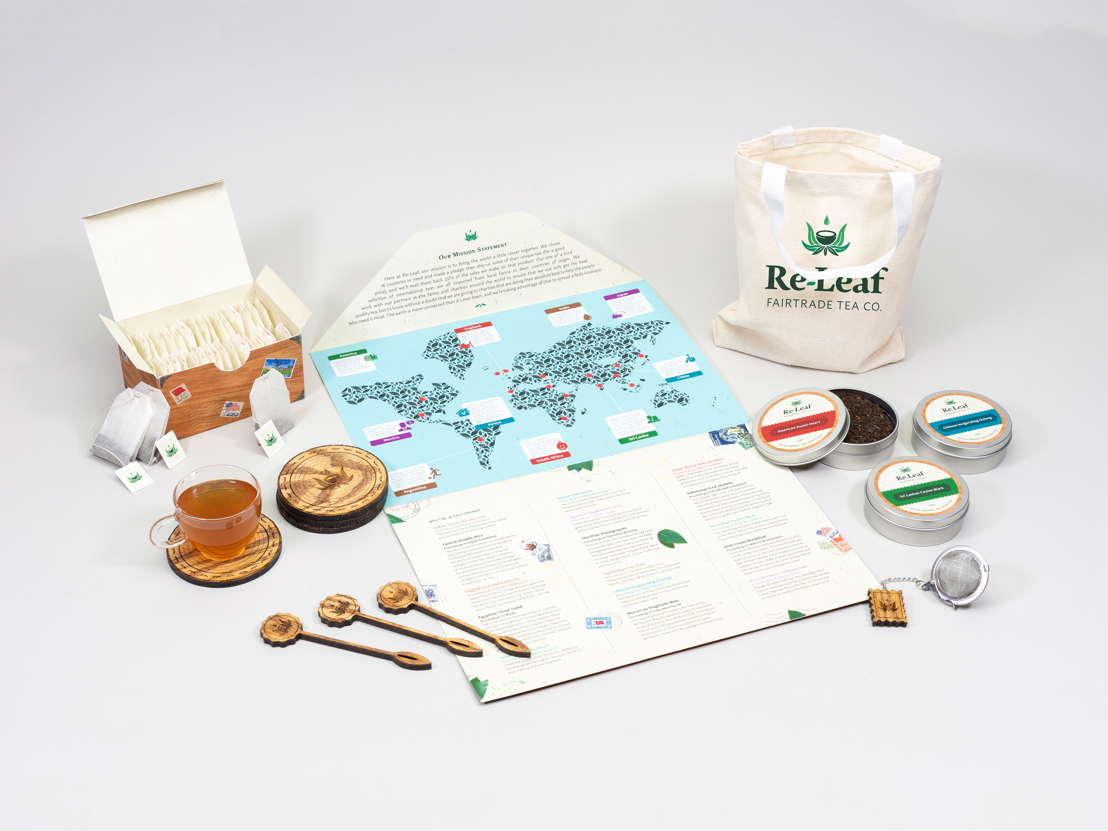 Re-leaf is a tea company with the goal to help people in need. Re-leaf is a fair trade company that sources its tea from specialty tea gardens all around the world. Not only do they buy from local workers, but they also give a portion of their profits to a charity in each and every country that they receive tea from. The packaging and branding elements relate the idea of global connectivity. By using the imagery of tea crates and postage stamps from the countries that are being helped, Re-leaf shows that we all have the ability to reach out and make a difference around the world.